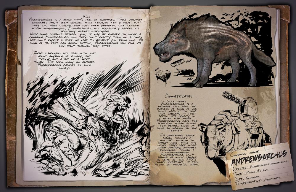 Andrewsarchus macht sich auf den Weg nach Fjordur und hat ein ganzes Arsenal an Hilfsmitteln dabei! Andrewsarchus mögen bei der Nahrungssuche träge wirken, aber sie können unerwartet schnell sein, wenn sie provoziert werden. Sobald er gezähmt ist, kannst du auf seinem Sattel eine Minigun anbringen!