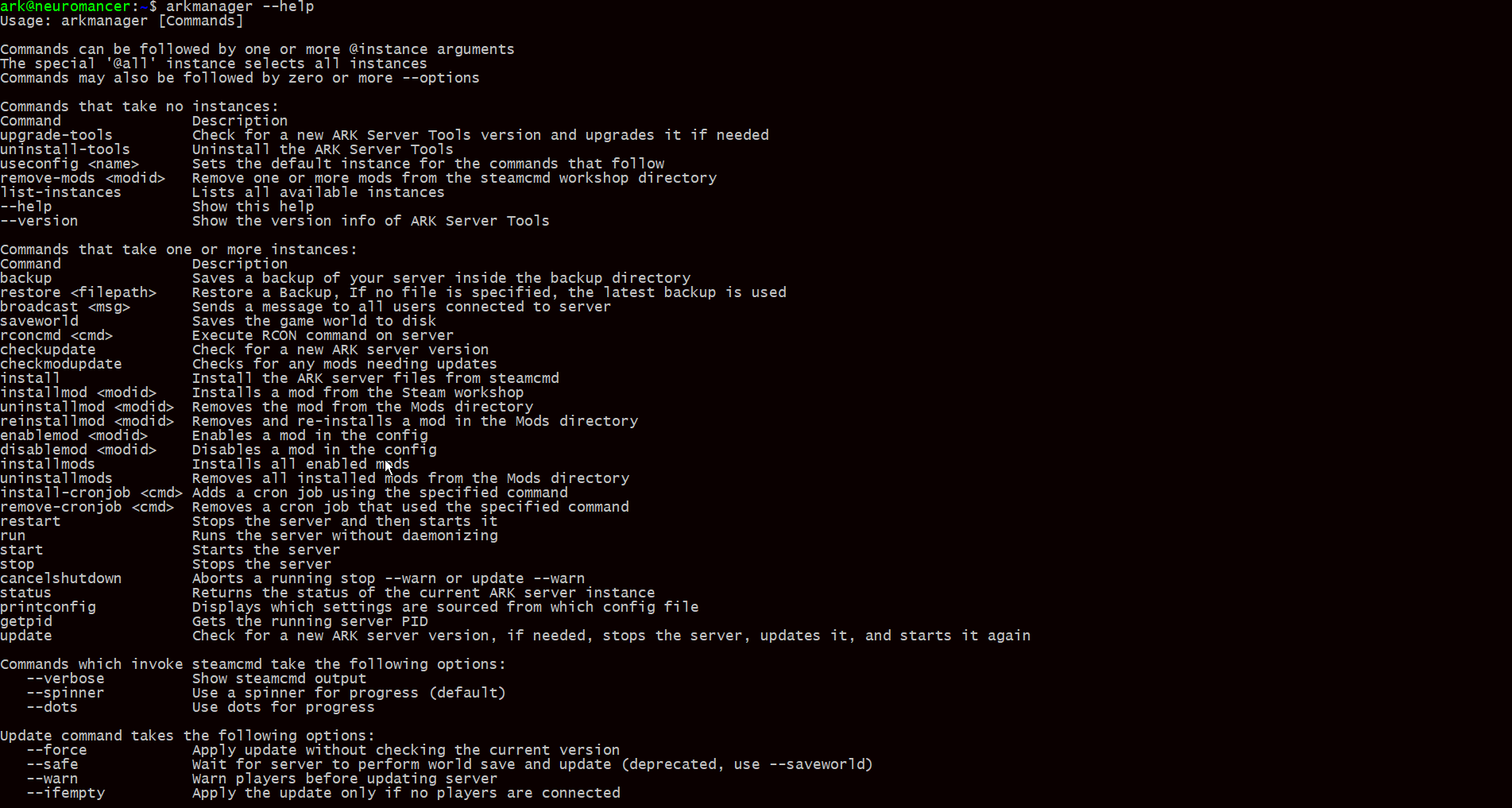 This tool allows you to manage any ARK: Survival Evolved linux server without having to remember long commands. It provides a lot of features, to get the full list check the Usage section.