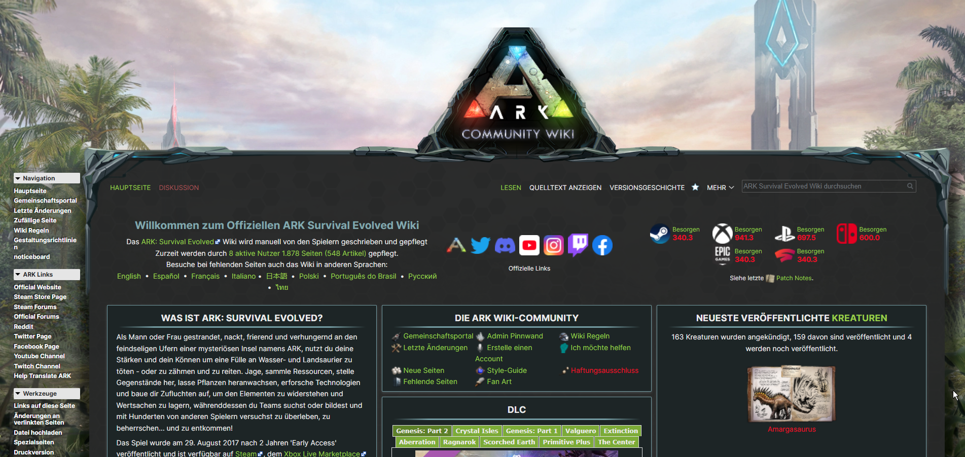 Heute ist ein offizielles (neues) ARK Wiki veröffentlicht worden. Das alte auf "Fandom" wird nicht mehr unterstützt, sonder es sollte nur noch dsa neue unter https://www.ark.wiki.gg verwendet werden. Eine Version auf Deutsch gibt es ebenfalls schon und jeder kann mitmachen und die Einträge verbessern! Zudem wird das Wiki auch von ARK selber und den jeweiligen Entwicklern fortlaufend ergänzt!